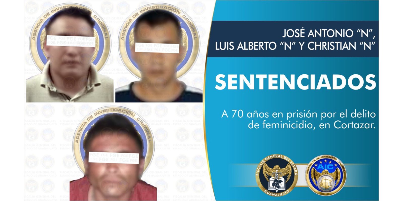 CORTAZAR, GTO;La Fiscalía General del Estado obtuvo sentencia condenatoria de 70 años en prisión en contra de JOSÉ ANTONIO “N”, LUIS ALBERTO “N” y CHRISTIAN “N”, culpables por el delito de feminicidio en agravio de dos jóvenes de 22 y 24 años, cuyos cadáveres abandonaron en un camino de terracería que conduce de la colonia Las Huertas a los Magueyes.